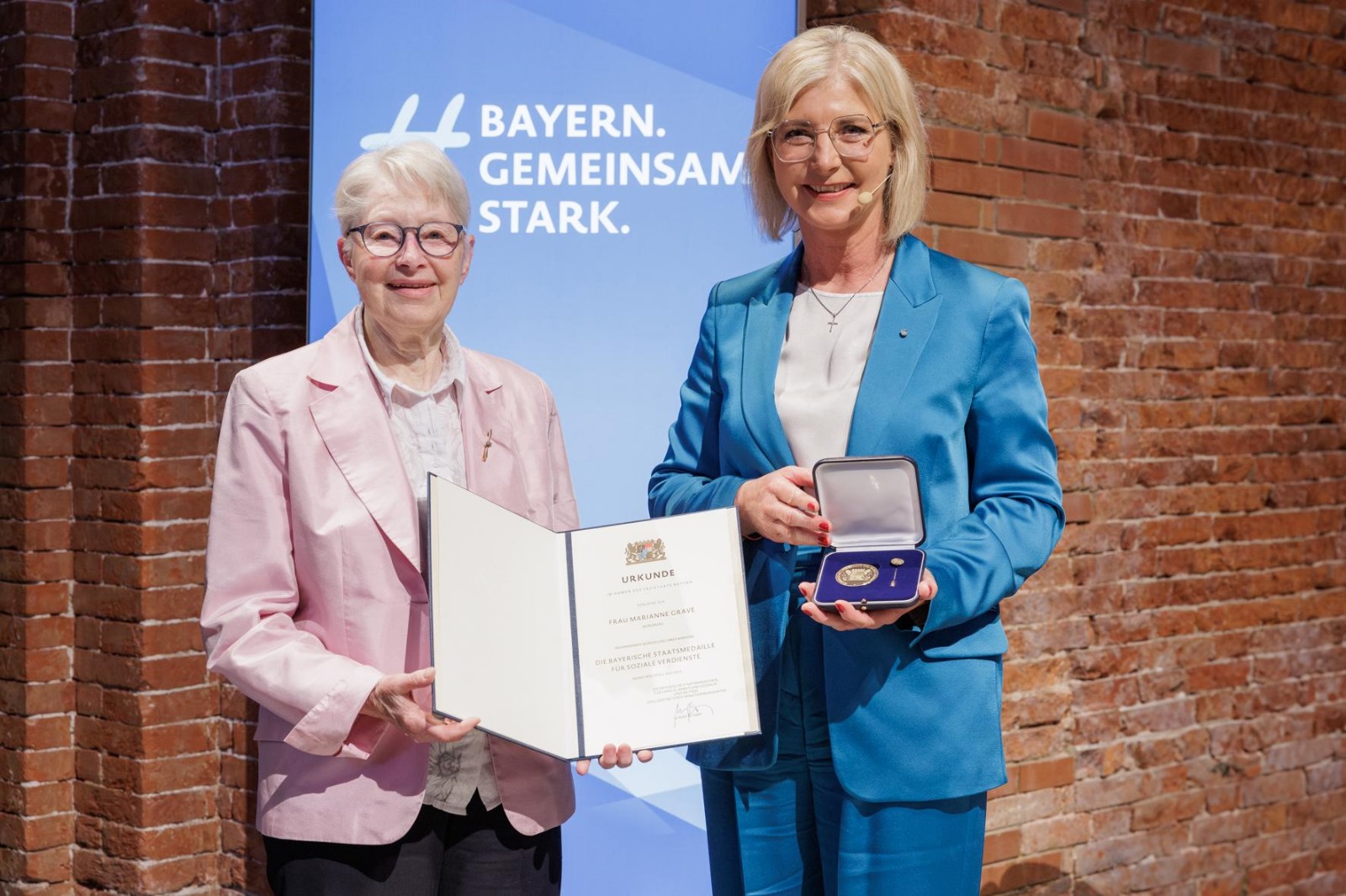 Am 3. April 2025 hat nun der Festakt in der Münchner Allerheiligen-Hofkirche stattgefunden. Mit Grave nach München gereist waren neben ihrer Schwester auch Peter Jaunich, mehrere engagierte Mitglieder des Vereins „Partnerschaft Lengfeld-Pacoti“ sowie Dr. M. Odileiz Sousa Cruz aus Brasilien. Die Moderation des Festakts übernahm Anuschka Horn vom Bayerischen Fernsehen. Laudatorin war die bayerische Staatsministerin für Arbeit und Soziales sowie stellvertretende Ministerpräsidentin Ulrike Scharf. Bürgerschaftliches Engagement wie das der hier Geehrten stärke den sozialen Zusammenhalt, verbessere den Dialog und die Lebensqualität und sei damit „nicht nur wesentlicher Bestandteil einer funktionierenden Demokratie, sondern auch Ausdruck der Verantwortung gegenüber Mitmenschen und der Umwelt“, dankte Scharf im Namen des Freistaats Bayern. Durch ihre Initiativen agieren diese Vorbilder als Katalysatoren für positive Veränderungen und leisten einen wertvollen Beitrag zu einer gerechteren und solidarischeren Gesellschaft, so die Staatsministerin.