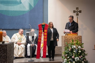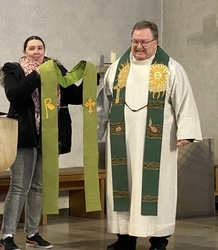 Für die Werktage und die Zeit im Jahreskreis überreichte Stefanie Flammersberger in der Folgewoche im Namen der Gemeinde St. Lioba eine grüne Stola. Sie formulierte den Dank der Gläubigen, "dass wir gerade bei den Werktagsgottesdiensten in besonderer Weise den Glauben mit Ihnen teilen und miteinander feiern können".