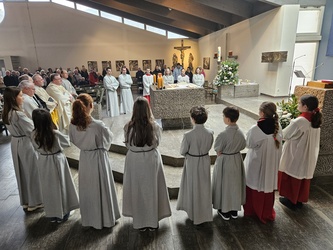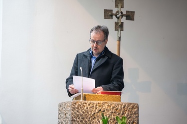 Mit einer Eucharistiefeier als geistliche Mitte seines priesterlichen Dienstes beging Fritsch sein silbernes Priesterjubiläum. Gemeinsam mit zahlreichen Christen aus den katholischen und der evangelischen Gemeinde, Freunden, Familie sowie einer großen Ministrantenschar aus dem ÖZ und St. Lioba verlieh er seiner Freude und Dankbarkeit darüber Ausdruck, „berufen worden zu sein, in Gemeinschaft mit der Kirche das Evangelium zu verkünden und Zeuge der Auferstehung zu sein“. Als Konzelebranten begrüßte Fritsch den evangelischen Pfarrer Stefan Meyer, Franziskaner-Pater Joseph Fischer, Kurskollegen Pfarrer Thomas Klemm sowie die beiden Lengfelder Diakone Gregor Groß und Thomas Braun. Für feierliche Stimmung sorgten der Kirchenchor unter Leitung von Ann-Kathrin Rauscher sowie Organist Ulrich Pakusch, seit 2023 Professor an der Hochschule für Musik und Theater Leipzig.