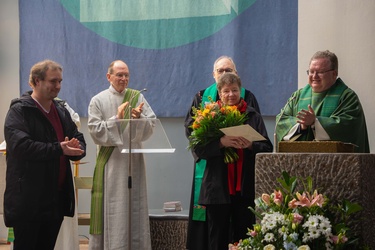 Am Ende des Gottesdienstes, der von Michael Heinrich an der Orgel und Lothar Wappes mit der Querflöte musikalisch gestaltet worden war, formulierte Fritsch seinen Dank als Dienstherr und Mensch. Die vielfältigen Aufgaben habe sie engagiert, strukturiert, verlässlich und in vertrauensvoller Zusammenarbeit erledigt. Zugleich habe sie ihren Beruf immer "als geistlichen Dienst und Dienst an Gott verstanden“: „Sie waren Ansprechpartner für die Menschen und haben auch mir persönlich wertvolle Impulse und Ideen gegeben.“ Dass Hohn auch künftig an Festtagen für den Blumenschmuck sorgen will, freute nicht nur Fritsch. Für den Ruhestand wünschte er Freude, Frieden, Aufatmen, Lebendigkeit und Zeit, um ganz im Sinne von Hohns Lieblingspsalm 23 Zeit bei Gott auszuruhen.