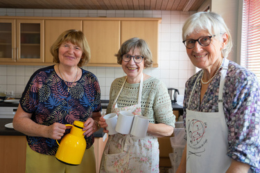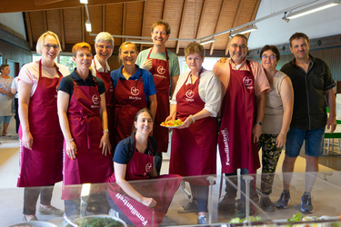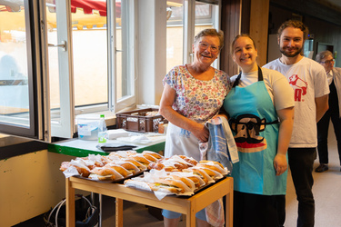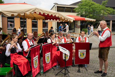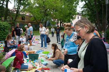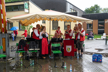 Den Auftakt des Festbetriebs im Hof und vor der Kürnachtalhalle machte die Blaskapelle Lengfeld; trotz heftigster Wolkengüsse spielten die Musikerinnen und Musiker eng unter einem Schirm zusammengekauert weiter und sorgten für beste Stimmung und treu verweilende Gäste. Sogar die vom Regen vertriebenen Anbieter und Kunden des Kinderflohmarkts kehrten tapfer zurück. Attraktiv für Kids und deren Eltern war auch das Kinderprogramm der Kindergärten, das Angebot des Familienstützpunkts und das Puppenstück „Kaspers Abenteuer mit den Waldtieren“ der Lengfelder Puppenbühne. Neben einem reichhaltigen gastronomischen Angebot mit Getränken, Grillgut und Pommes, bunten Salattellern vom Familienkreis, belegten Brötchen vom ehemaligen Frauenbund, frischen Waffeln von den Minis, alkoholfreien Cocktails von der Offenen Jugendarbeit JuZ und einem reichhaltigen Kuchenbuffet, gab es auch Informationen zum Pastoralen Raum, vom Verein „Partnerschaft Lengfeld – Pacoti“ und vom Lengfelder Bürgerverein. Bei einem Foto-Gewinnspiel rund um den Katholikentag gab es attraktive Preise zu gewinnen.