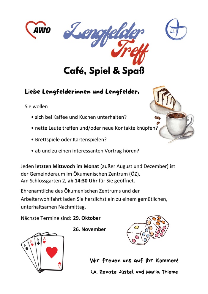 Café, Spiel & Spaß im Gemeinderaum (ÖZ) Sich bei Kaffee und Kuchen unterhalten, nette Leute treffen und/oder neue Kontakte knüpfen, Brettspiele oder Kartenspielen, gemeinsam singen: ÖZ und Arbeiterwohlfahrt laden dazu am letzten Mittwoch jeden Monats (außer August und Dezember) ab 14:30 Uhr ein.