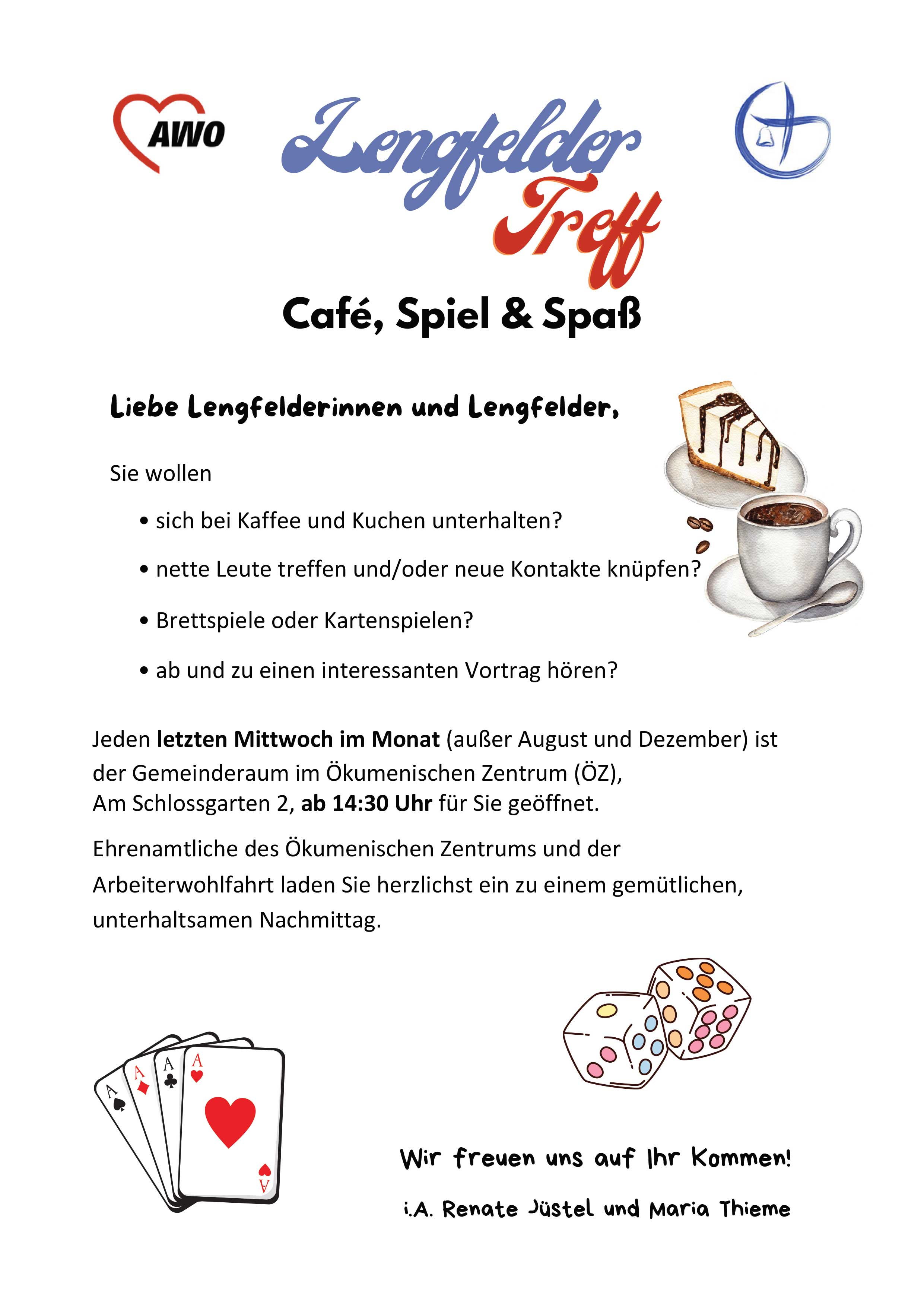 Café, Spiel & Spaß im Gemeinderaum (ÖZ) Sich bei Kaffee und Kuchen unterhalten, nette Leute treffen und/oder neue Kontakte knüpfen, Brettspiele oder Kartenspielen, gemeinsam singen: ÖZ und Arbeiterwohlfahrt laden dazu am letzten Mittwoch jeden Monats (außer August und Dezember) ab 14:30 Uhr ein.